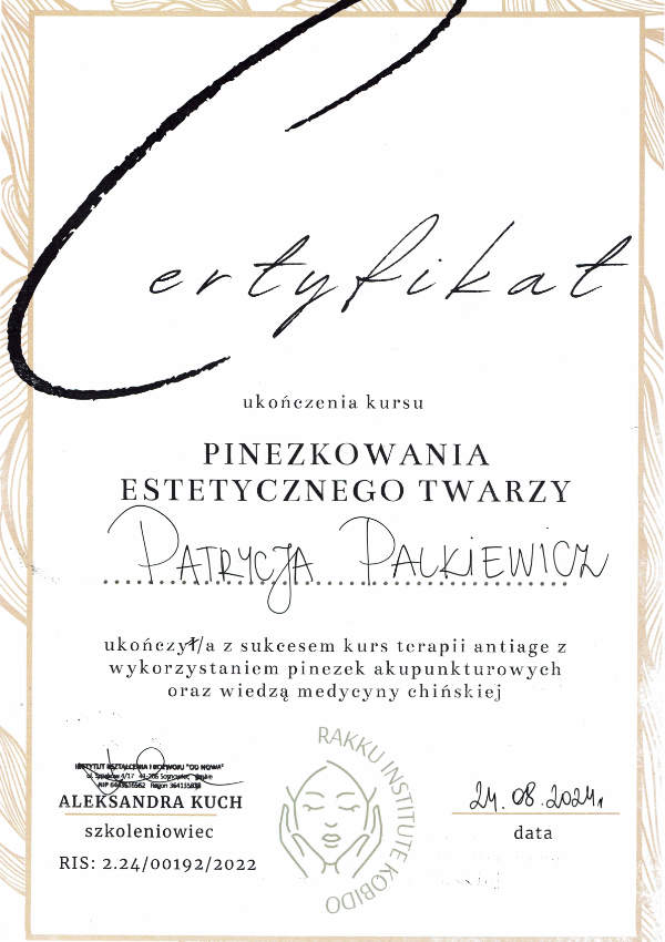 Po latach praktyki wiem, że każdy potrzebuje indywidualnego podejścia. Dlatego oferuję kompleksową opiekę: od wsparcia dietetycznego, przez psychodietetykę, po zabiegi upiększające i relaksacyjne. Specjalizuję się w autorskim masażu odchudzającym, masażu kobido oraz pinezkowaniu estetycznym twarzy. To połączenie pozwala mi zadbać o Ciebie całościowo – o Twoje ciało, twarz i umysł. Bo prawdziwe piękno zaczyna się od harmonii wszystkich tych elementów.