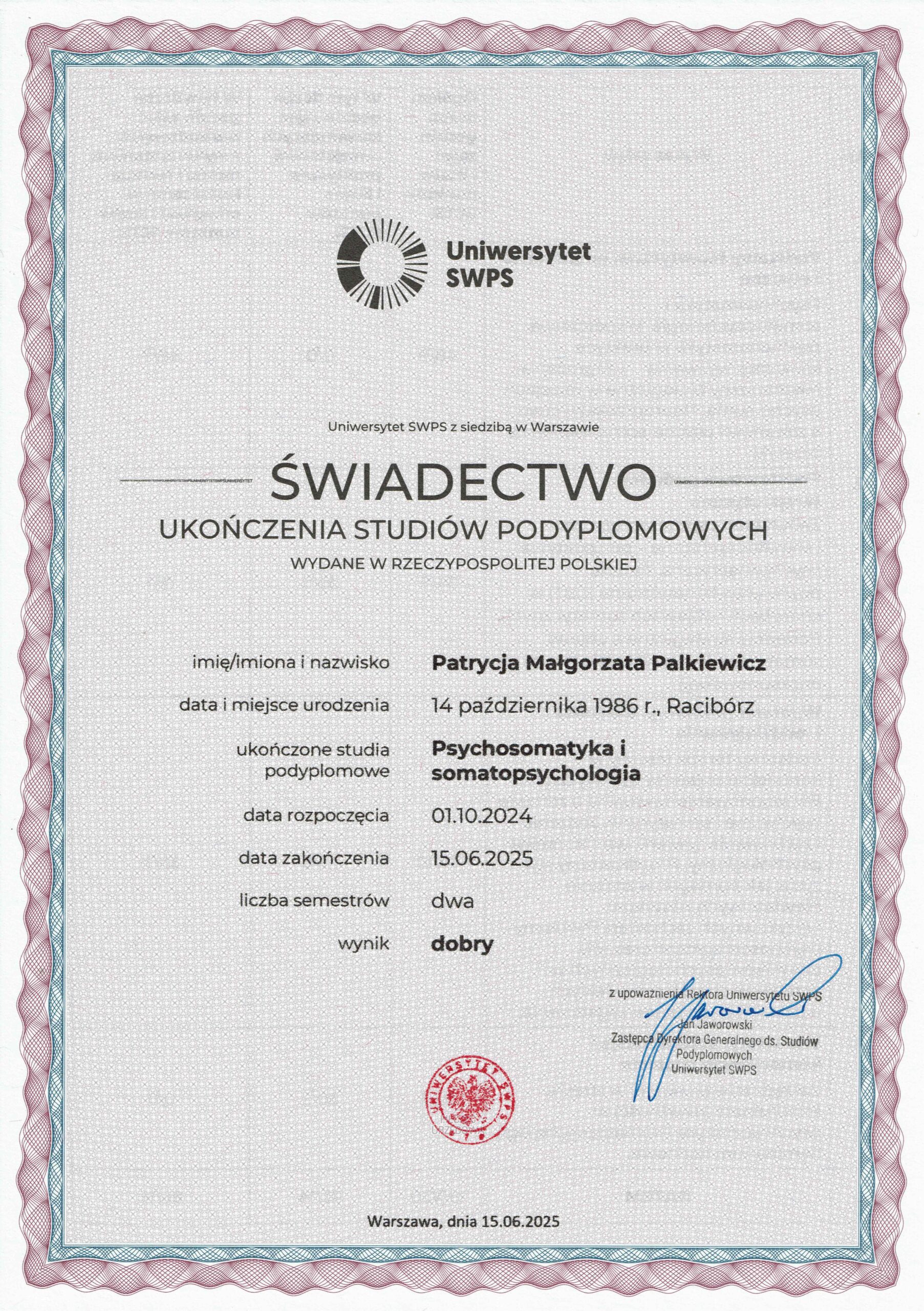 Długoletnia praktyka nauczyła mnie, że każdy człowiek jest inny i zasługuje na indywidualne podejście. Przez lata zdobyłam nie tylko wiedzę i umiejętności, ale przede wszystkim zrozumienie ludzkich potrzeb i wyzwań. Każda historia mojego klienta to dla mnie nowa inspiracja do rozwoju.